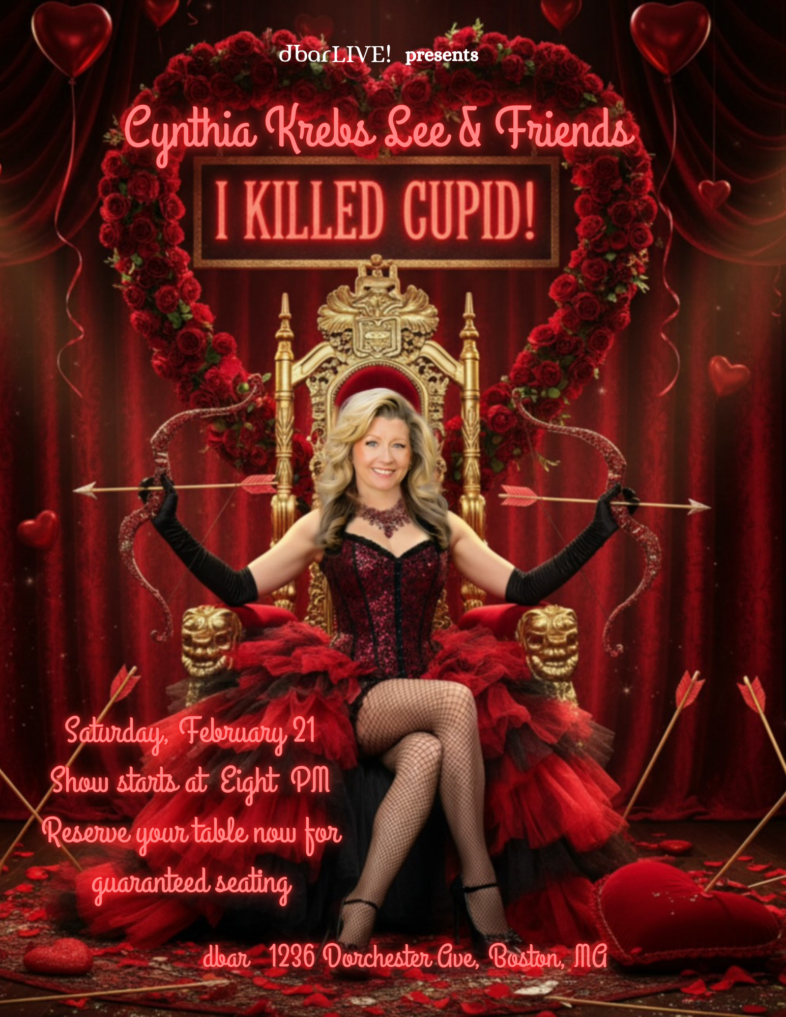 Join us on Saturday, February 21st for "I Killed Cupid" - the next Cabaret show in our "dbarLIVE" series! Starring the amazingly gifted Cynthia Krebs Lee and featuring performances by her incredibly talented friends! Come early and enjoy a delicious dinner and your favorite cocktails. The show will begin at 8pm!